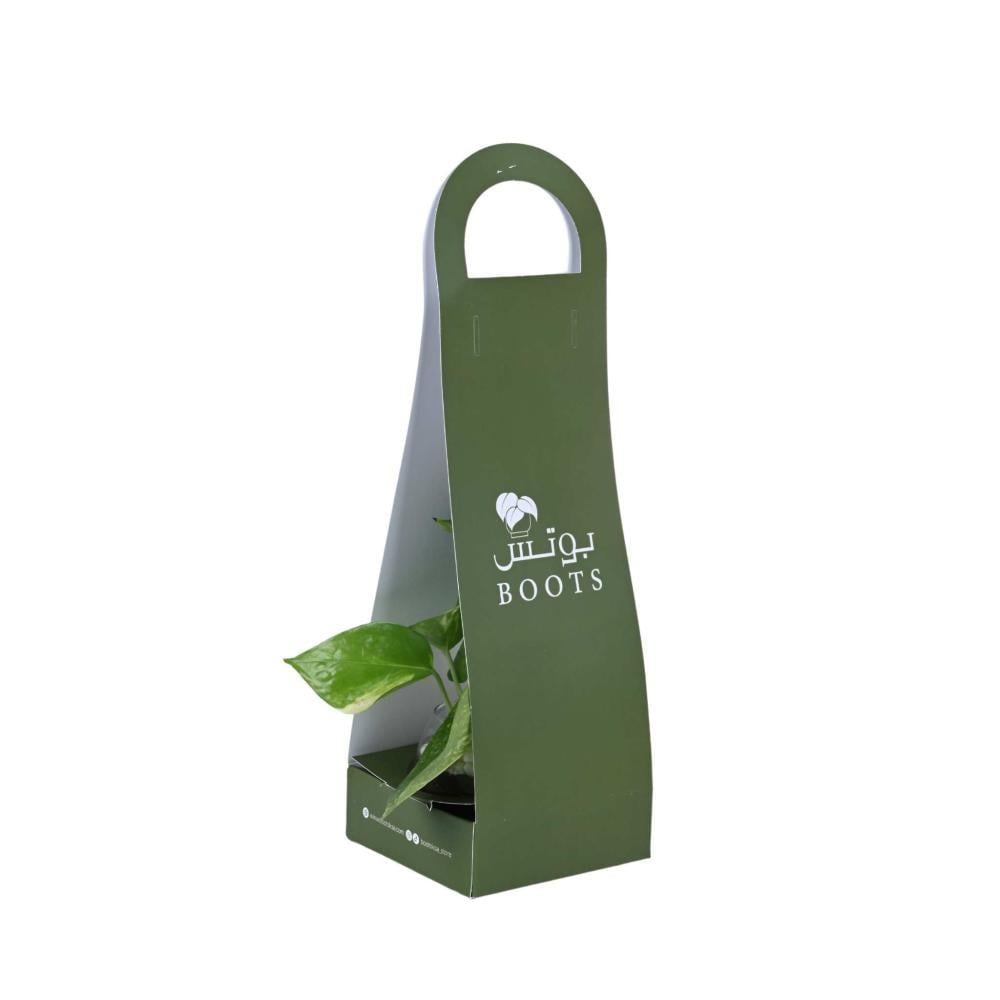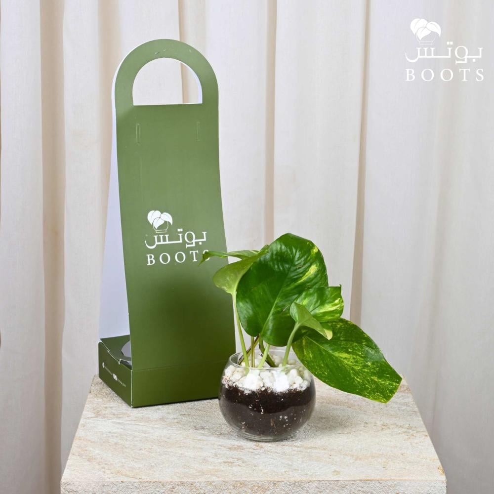 نبتة بوتس طبيعية في فازة زجاجية أنيقة، موضوعة داخل شنطة بوتس الفاخرة. هدية عصرية تضيف لمسة خضراء راقية للمكان