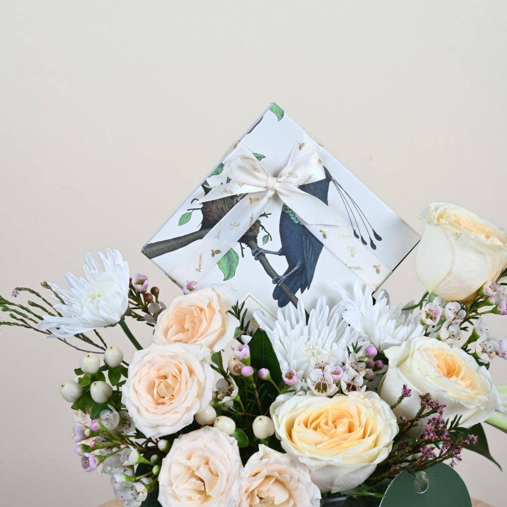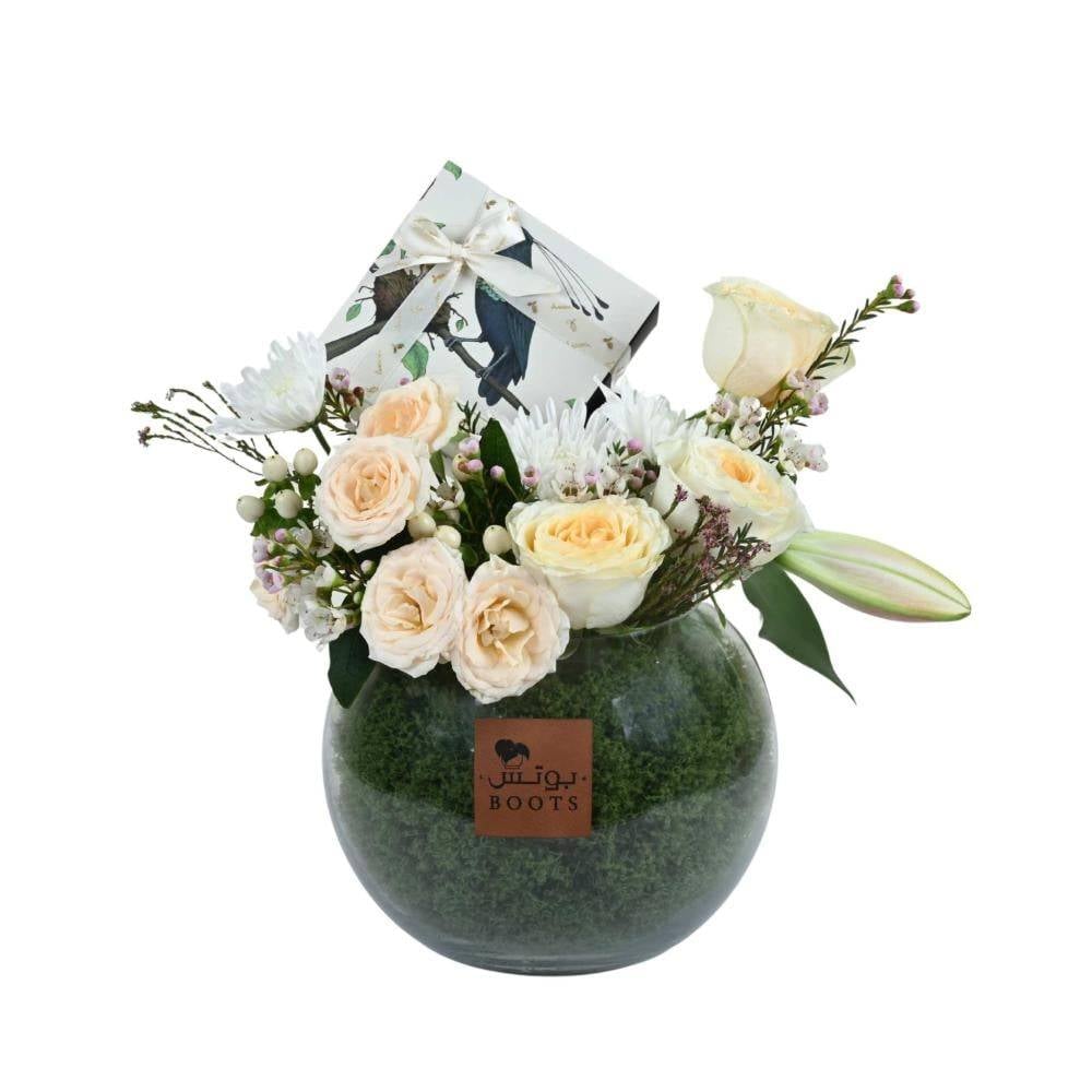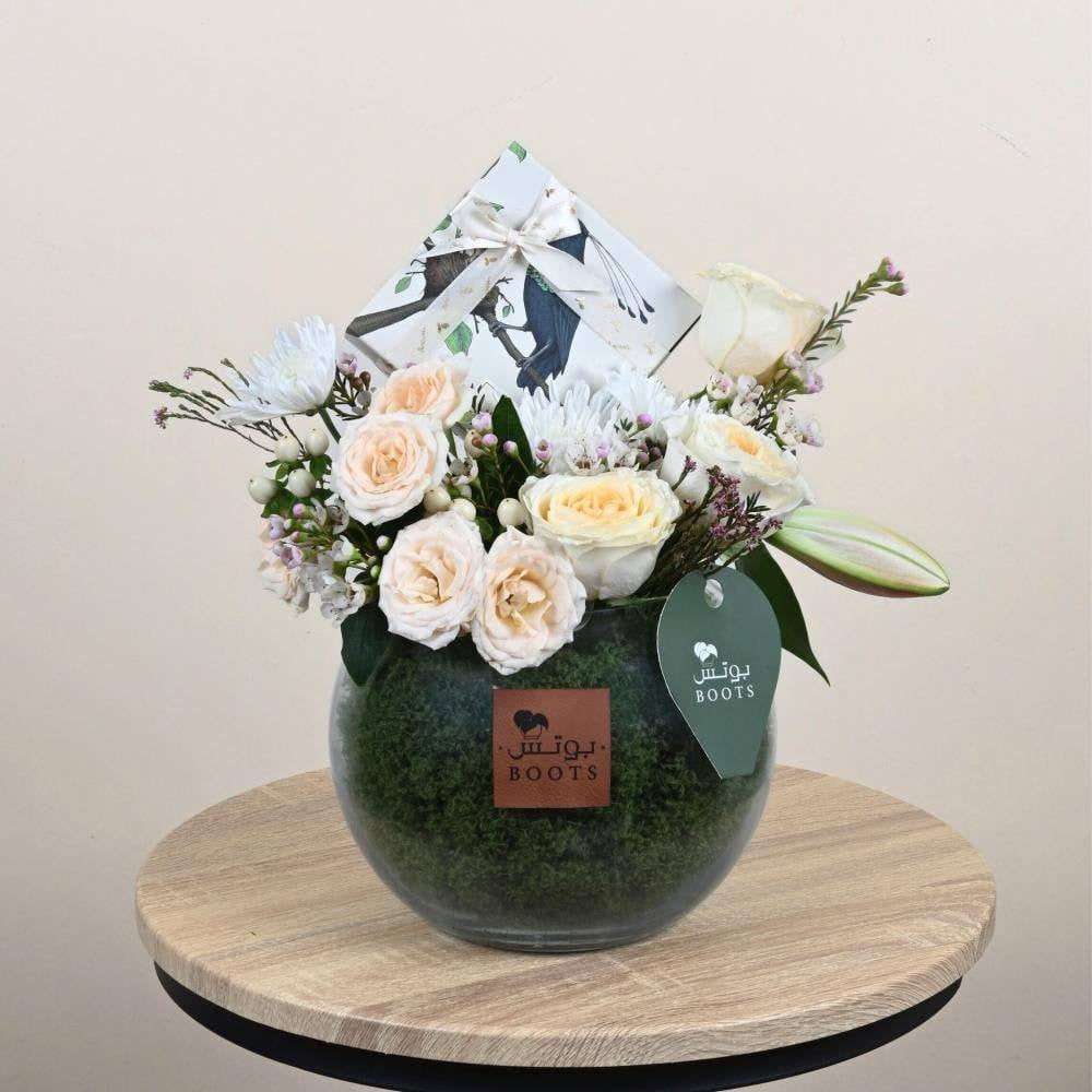 - ورود طبيعية بتدرجات الأبيض والبيج داخل فازة زجاجية مستديرة مع شوكولاتة فاخرة من انوش. تنسيق هادئ وأنيق، مناسب للعدايا وهدايا المناسبات الخاصة