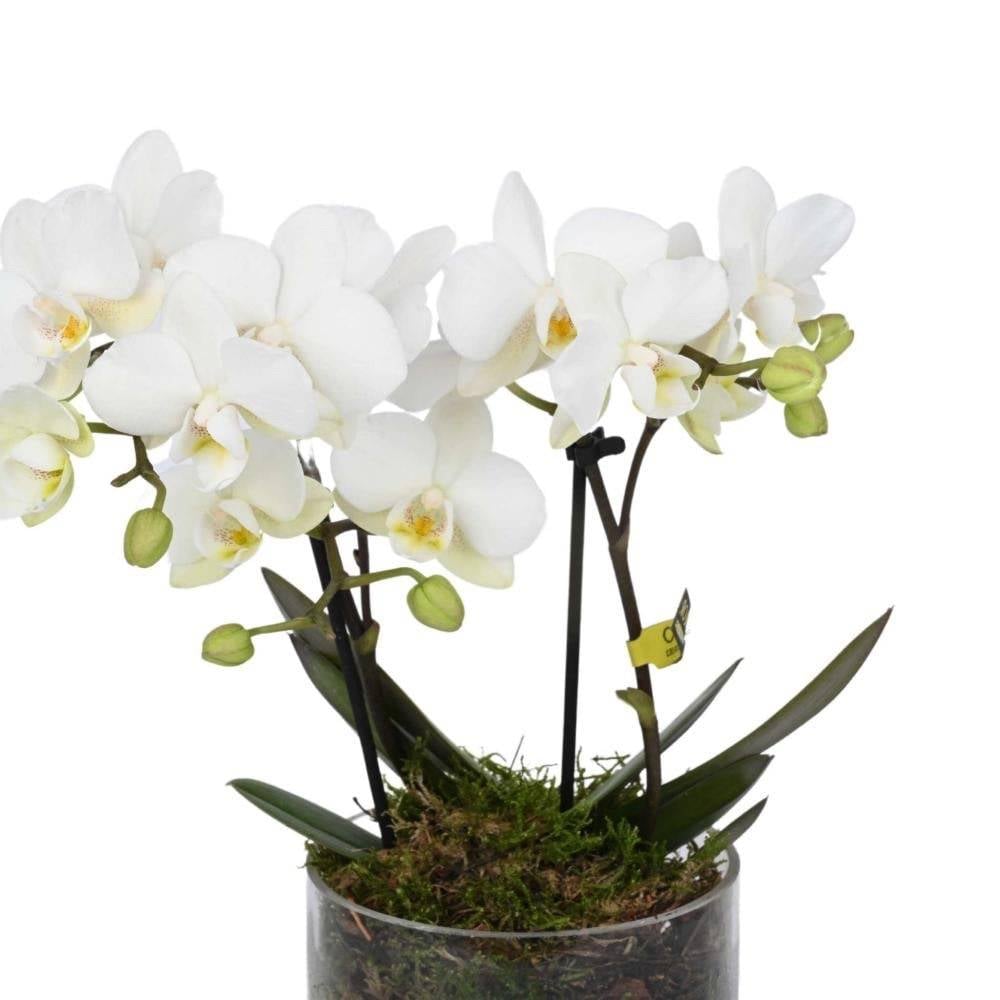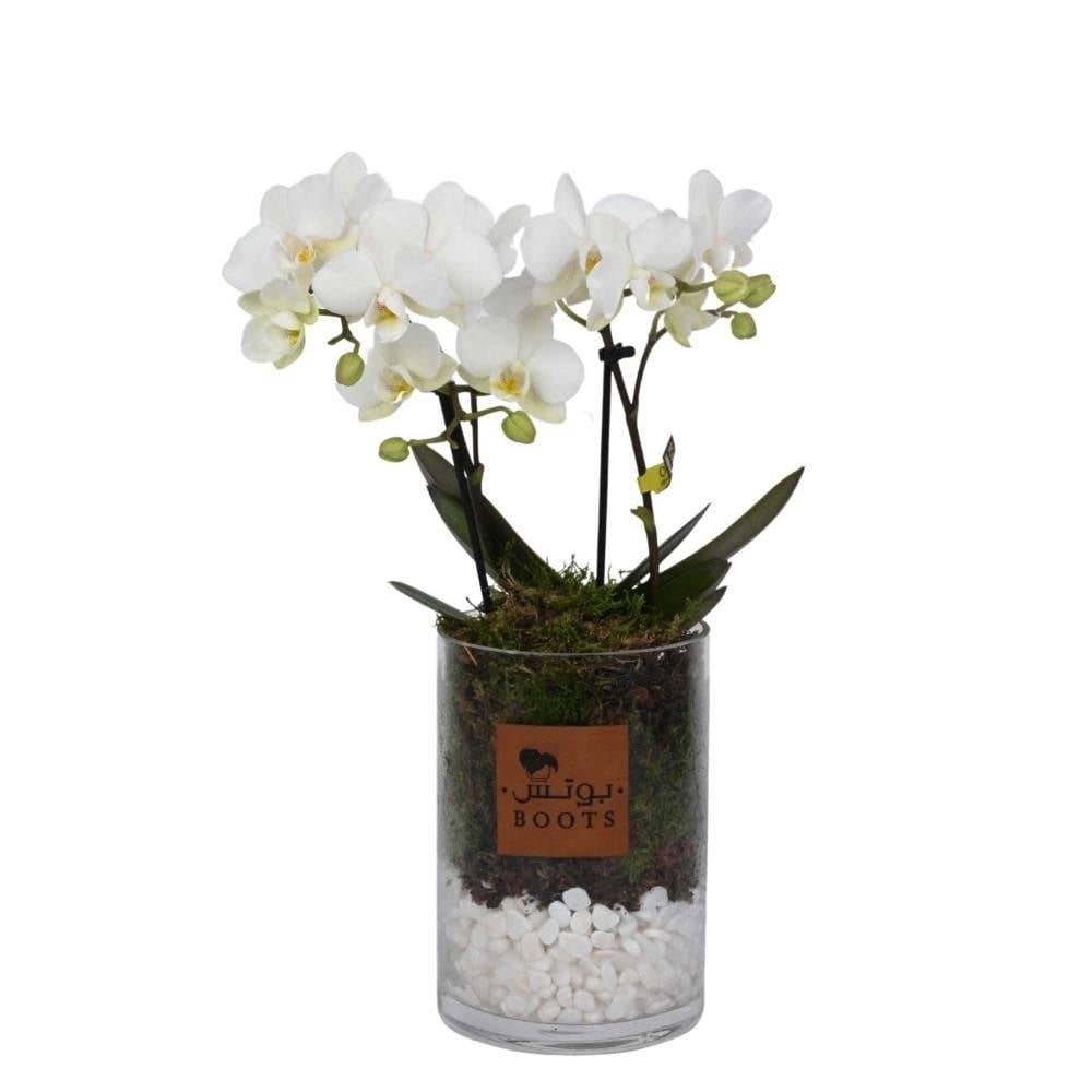 نبتة أوركيد أبيض طبيعية بزهور ناعمة، مزروعة في فازة زجاجية شفافة مع طبقة من الطحالب والحصى. تضيف هدوءًا وأناقة إلى ديكورك