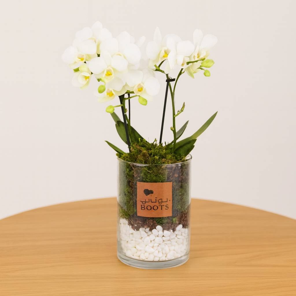 نبتة أوركيد أبيض طبيعية بزهور ناعمة، مزروعة في فازة زجاجية شفافة مع طبقة من الطحالب والحصى. تضيف هدوءًا وأناقة إلى ديكورك