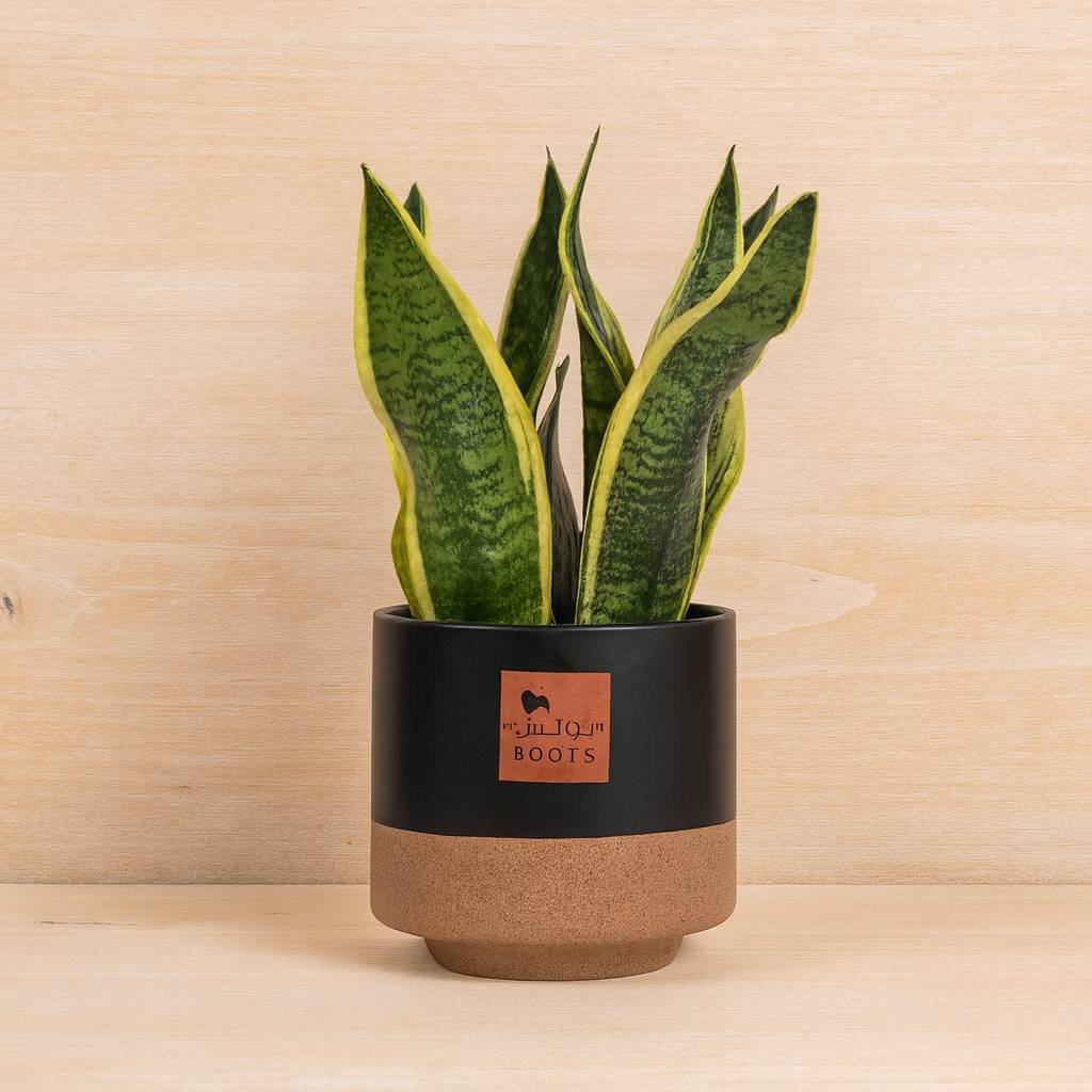 نبتة سانسيفيريا الطبيعية داخل أصيص فاخر بلون أسود مع قاعدة بلون ترابي، تضيف لمسة فخمة وعصرية لأي مساحة.