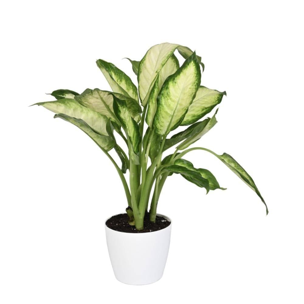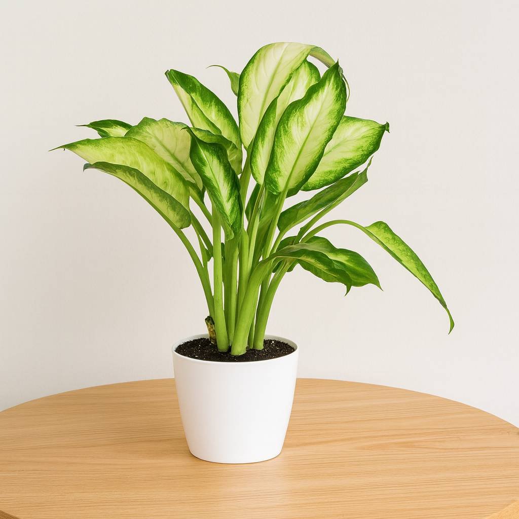 نبتة ديفنباخيا بلونها الأخضر الكريمي تقدم في فازة بلاستيك بيضاء بسيطة. تنسيق مثالي لمحبي الهدوء والبساطة في ديكور المنزل أو المكتب