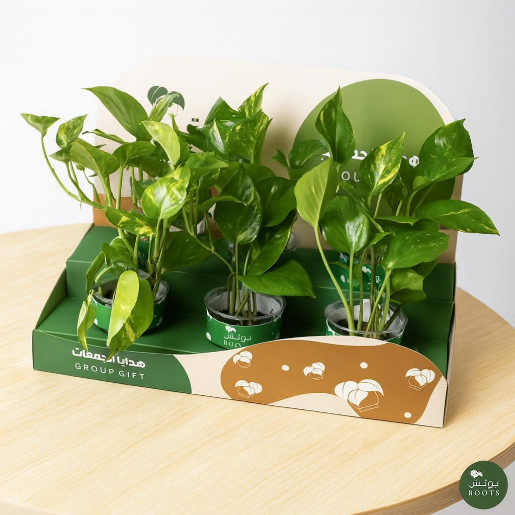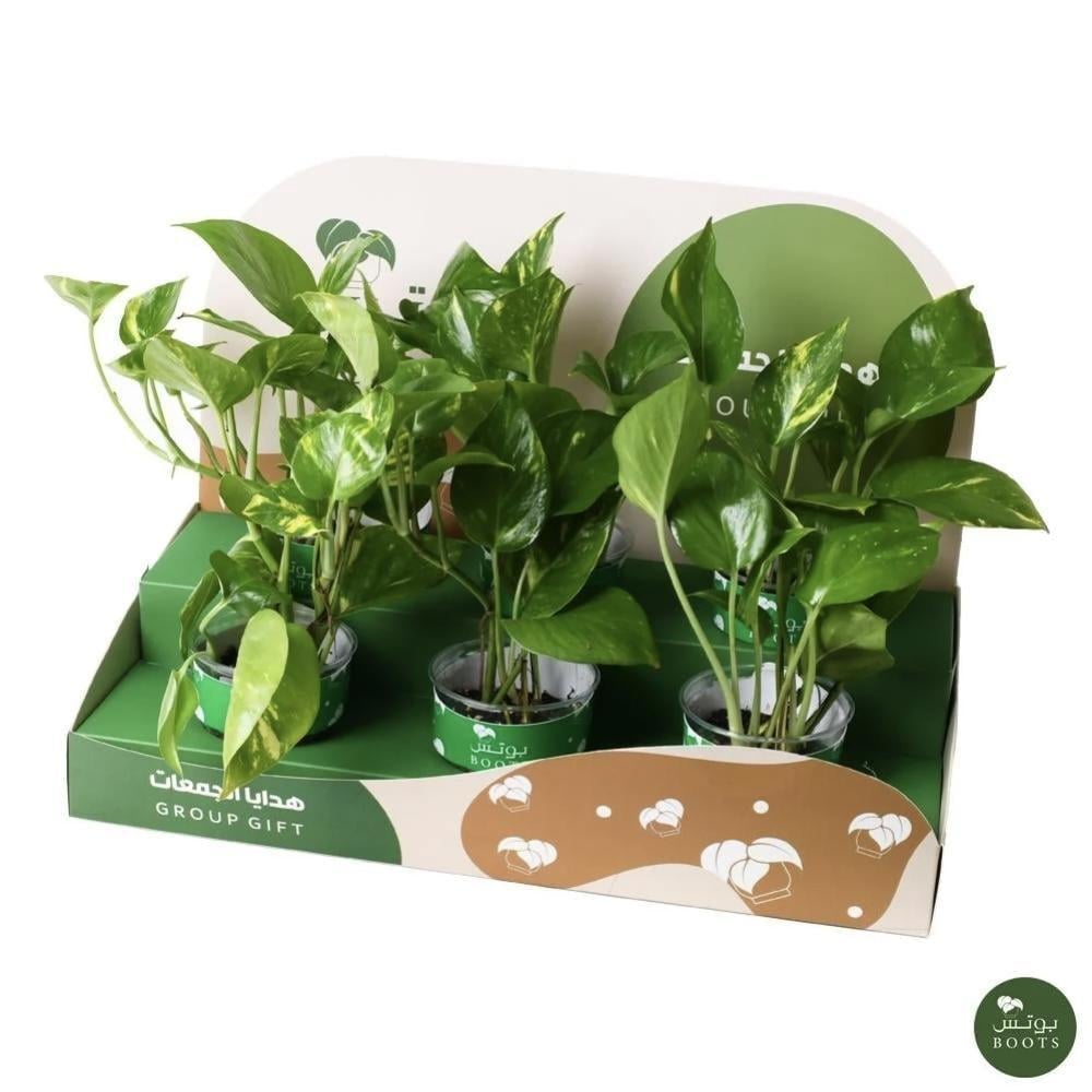 بوكس أنيق يحتوي على 6 نبتات بوتس طبيعية بأحواض صغيرة، مغلف بتصميم مميز مكتوب عليه “هدايا الجمعات”. مثالي لتوزيعات الشركات، الهدايا الجماعية، الاجتماعات، الأعياد، الحفلات والعدايا