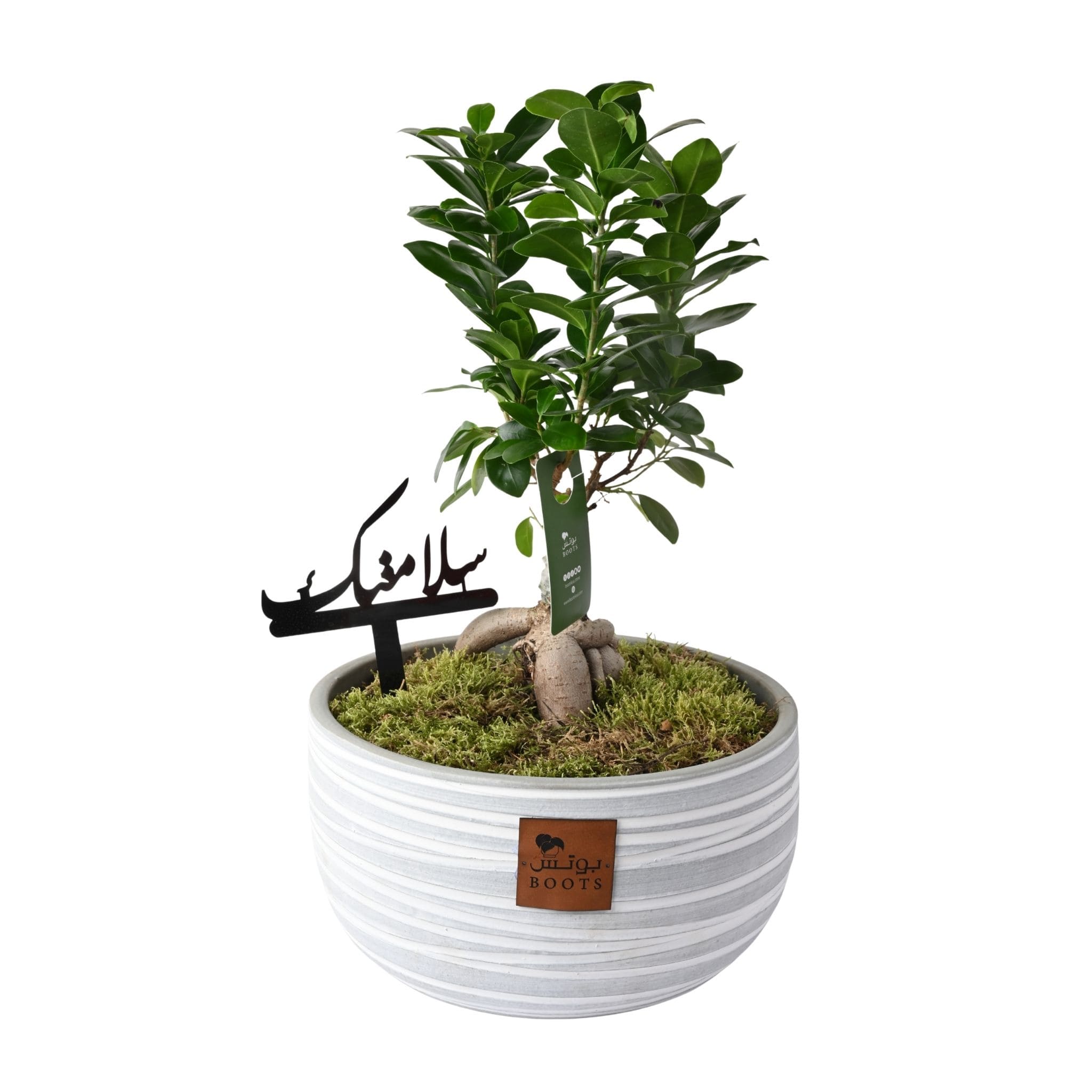نبتة فيكس بونساي طبيعية بتصميم مميز داخل فخار مخطط بدرجات الأبيض والرمادي يحمل شعار بوتس، مزينة بقاعدة من الطحالب الطبيعية وعبارة “سلامتك” بخط عربي فخم.