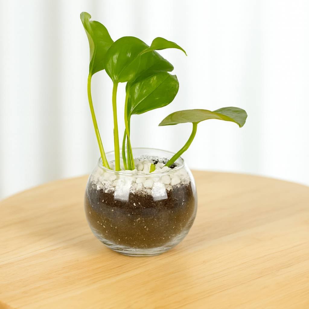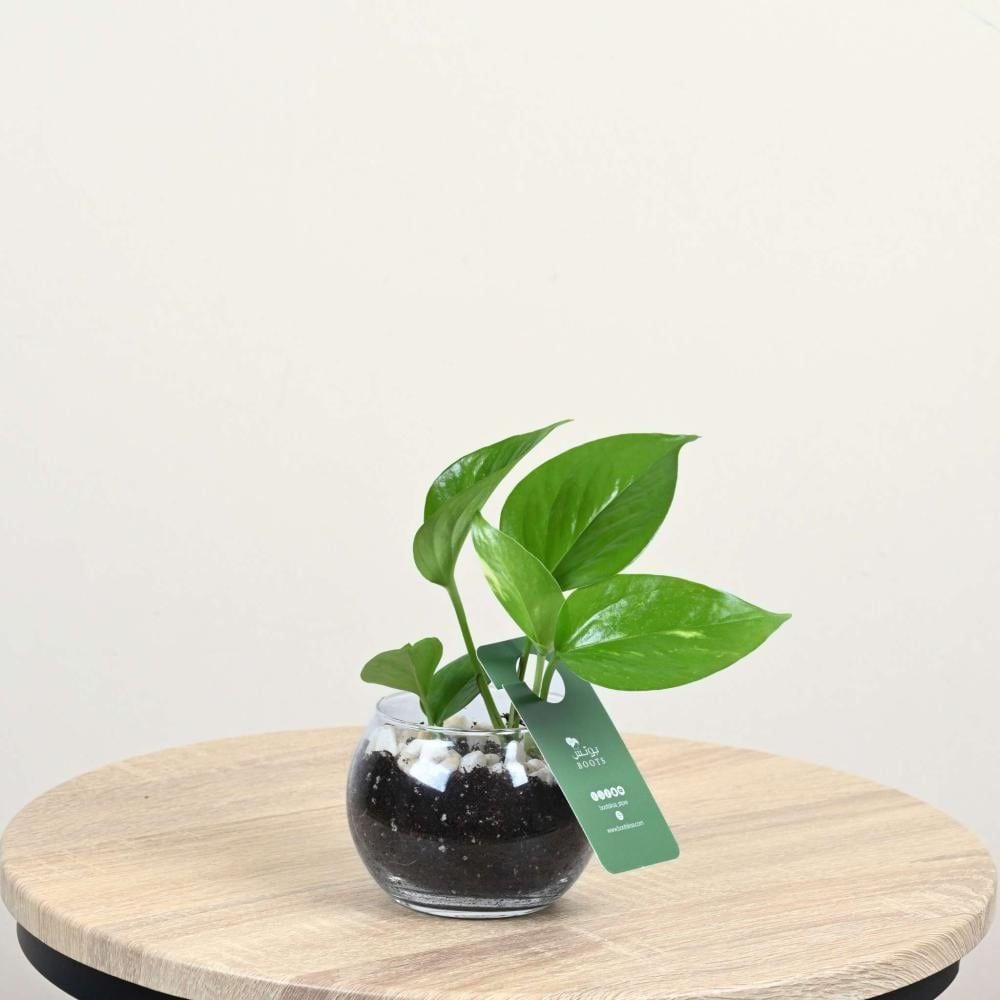 نبتة بوتس طبيعية مزروعة بعناية داخل وعاء زجاجي كروي شفاف مملوء بالتربة والحصى الأبيض، تصميم بسيط وأنيق يناسب التوزيعات الفردية في الأعياد، العدايا، والفعاليات الرسمية والخاصة